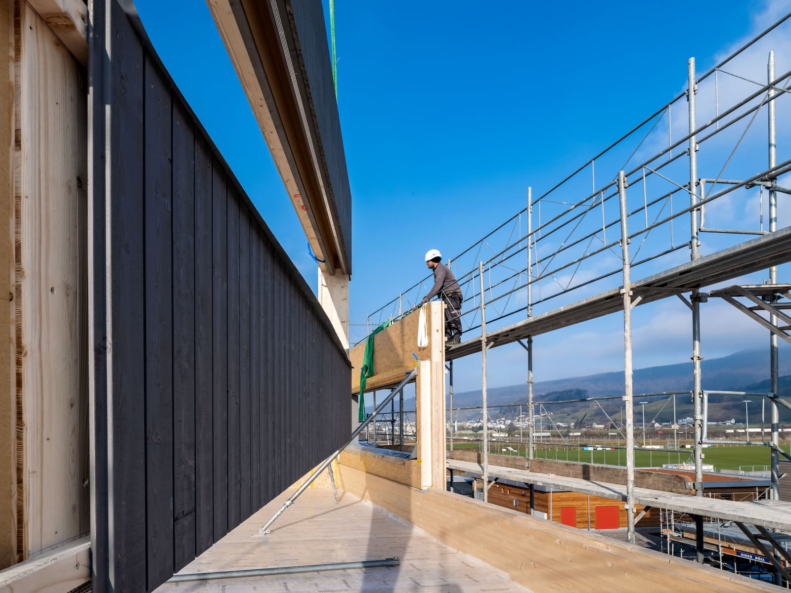 Die Vorfertigung der Aussenwände im Holzsystembau spielte eine massgebliche Rolle für eine schnelle und präzise Montage vor Ort, was zu verkürzten Bauzeiten führte. Zusätzlich wurde ein Grossteil der stehenden Fassadenschalung bereits im Werk vormontiert, um eine reibungslose Installation sicherzustellen.