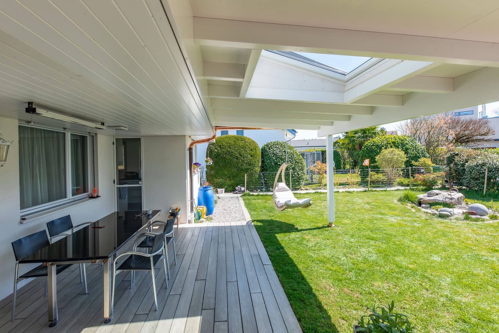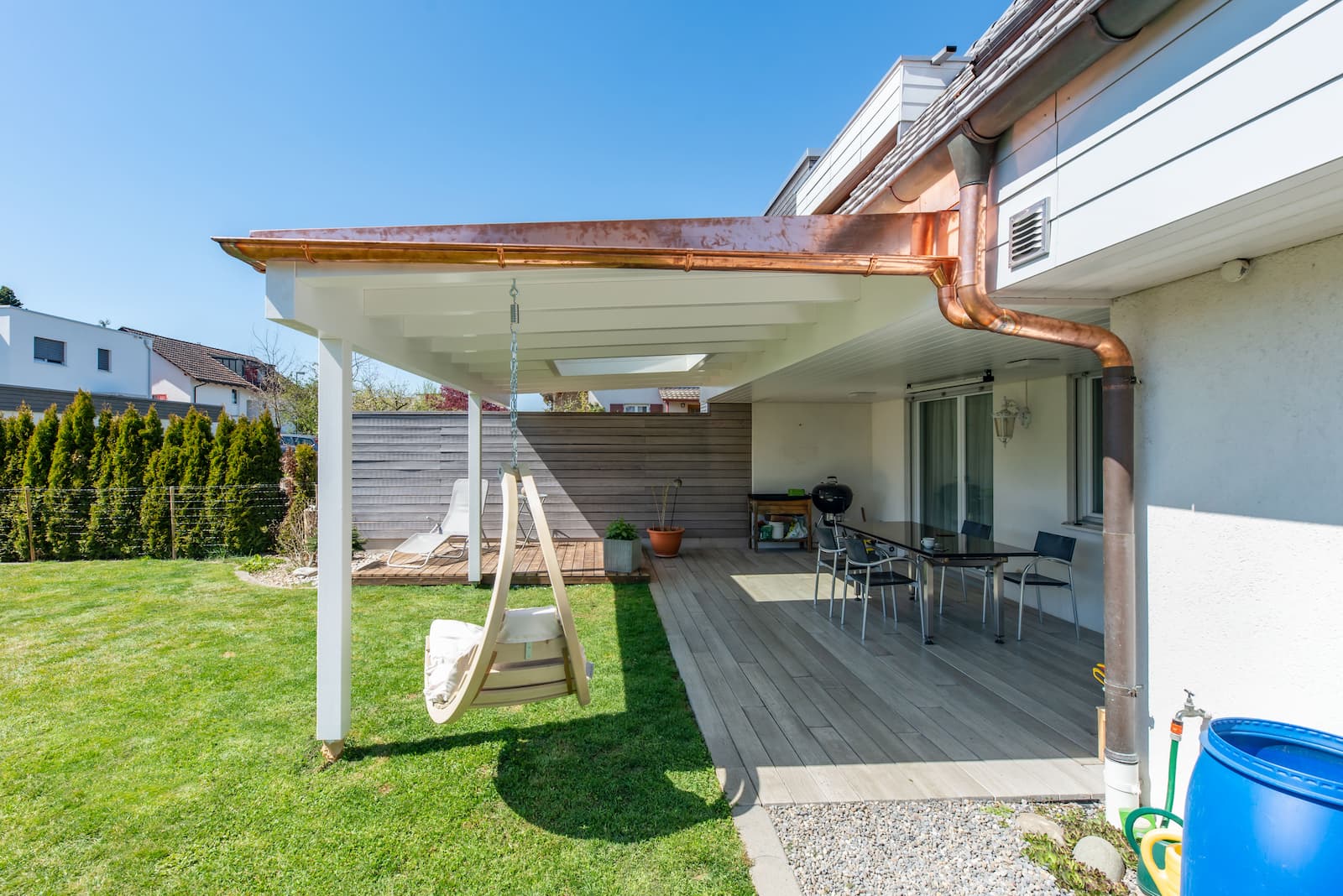 Unser Holzbauteam realisierte in Rütihof eine moderne und funktionale Terrassenüberdachung. Der dauerhafte Terrassenrost aus Kebony Kiefer verleiht der Struktur nicht nur eine ansprechende Optik, sondern bietet auch hohe Witterungsbeständigkeit.