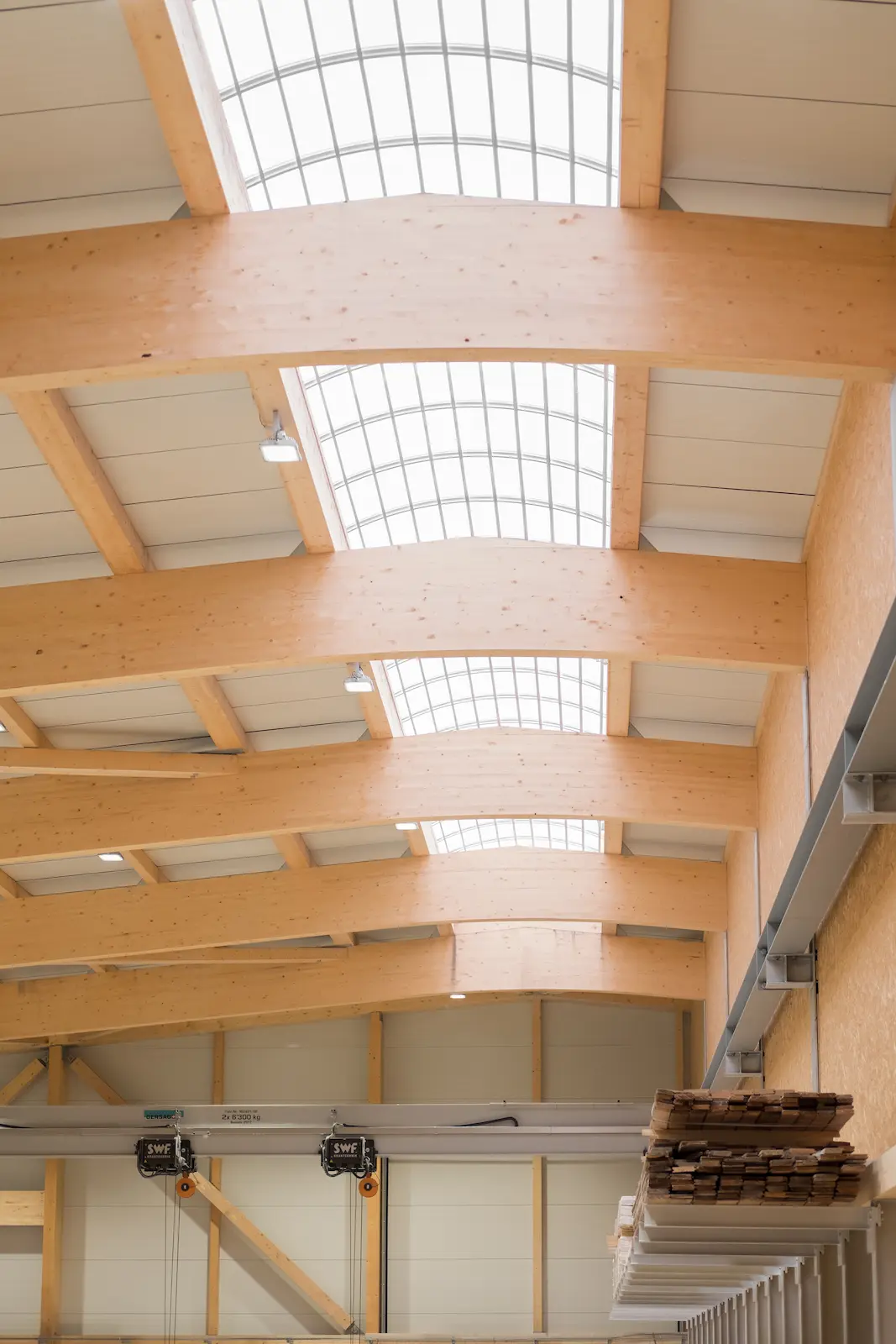 Das Tragwerk des Betriebsgebäudes in Kleindöttingen zeigt die Leistungsfähigkeit und Präzision des modernen Holzbaus